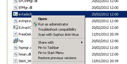 From the SCCM 2012 media copy the \SMSSetup\Bin\x64\ folder to a Domain Controller. Right click the Extadsch.exe and choose ‘Run as Administrator ‘