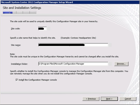 Enter a three character Site Code and Site Description and enter the installation location for SCCM.