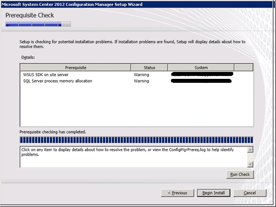 The SCCM install will re-run the pre-req check. Click Begin Install.