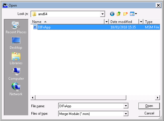 Import the x64 DIFxApp merge module from the directory C:\WinDDK\7600.16385.1\redist\DIFx\DIFxApp\MergeModule\amd64. Click Open then click Ok.