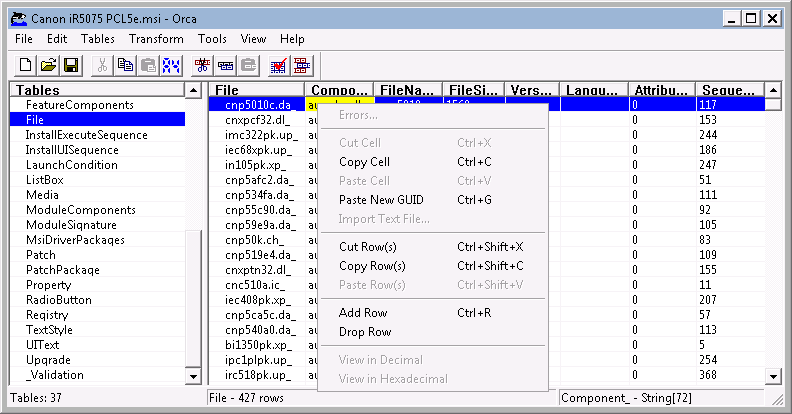 In the File table, find the row containing the driver’s .inf file and copy the value from the Component_ column.