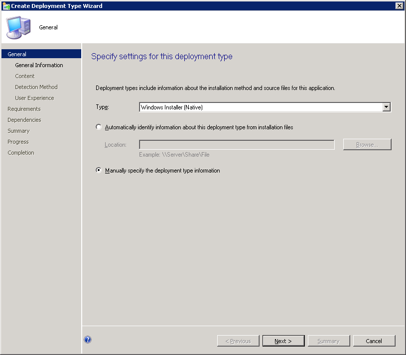 The choices for application type in SCCM 2012’s Application drop down does not include an option to install .exe. There’s a way around this to get an exe file deployed.