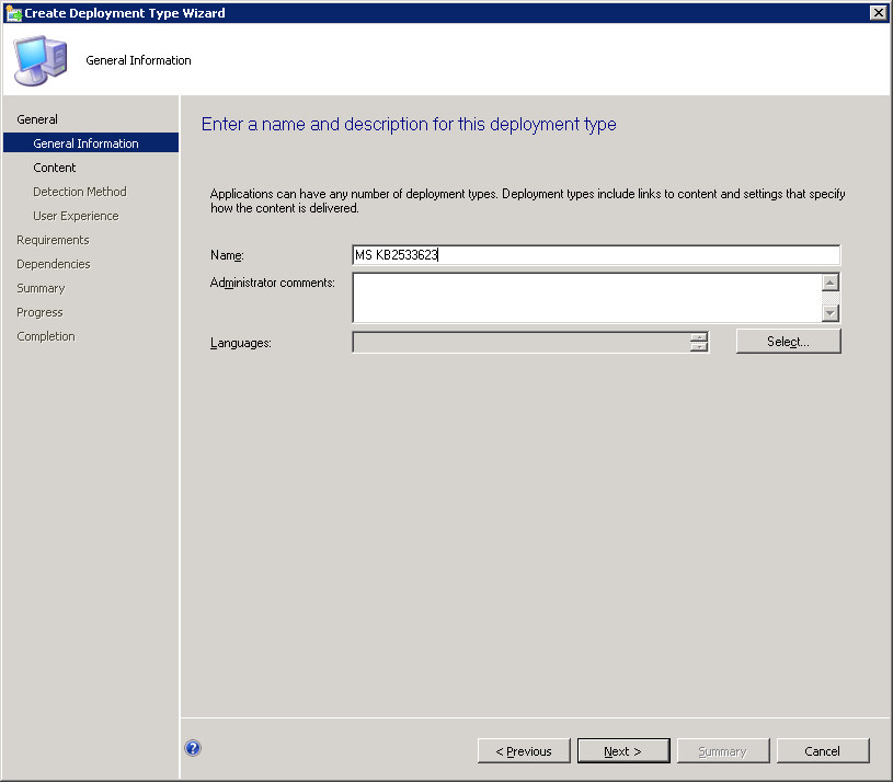 In the following example I will actually be deploying a Microsoft Hotfix (KB2533623) which is really an .msu file. However the command to deploy the hoftfix is wusa.exe Windows6.1-KB2533623-x64.msu /quiet /norestart so I am referencing an .exe for the installation.