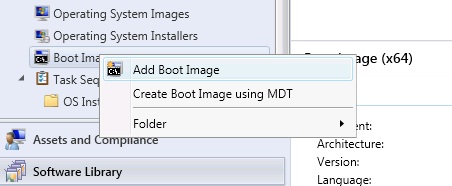 In the SCCM console go to the Software Library workspace. Open Operating Systems>Boot Images. Right click and choose ‘Add Boot Image’.