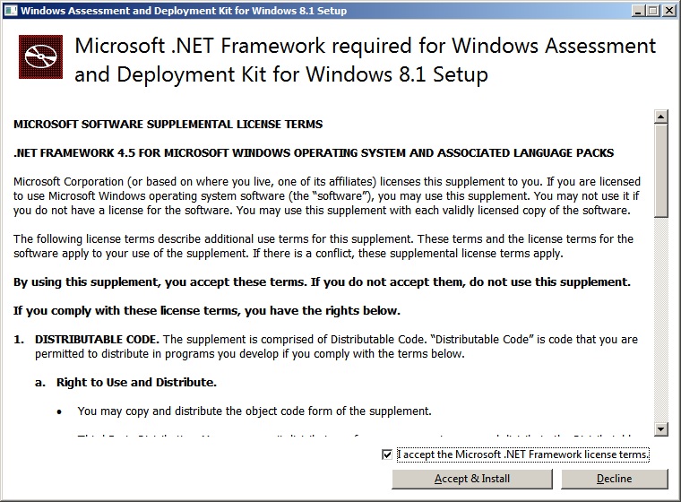 Run the adksetup.exe file. Accept the licence agreement. This will download and install .Net Framework 4.5.