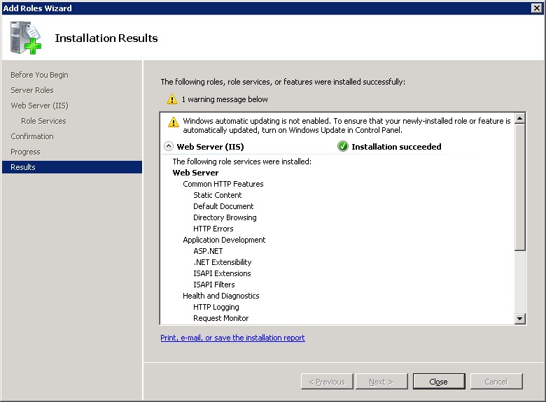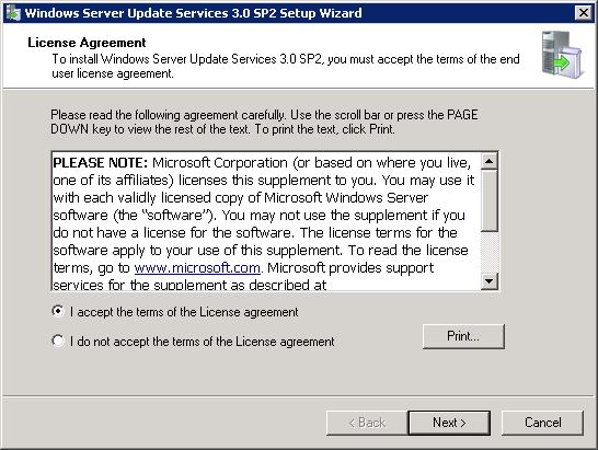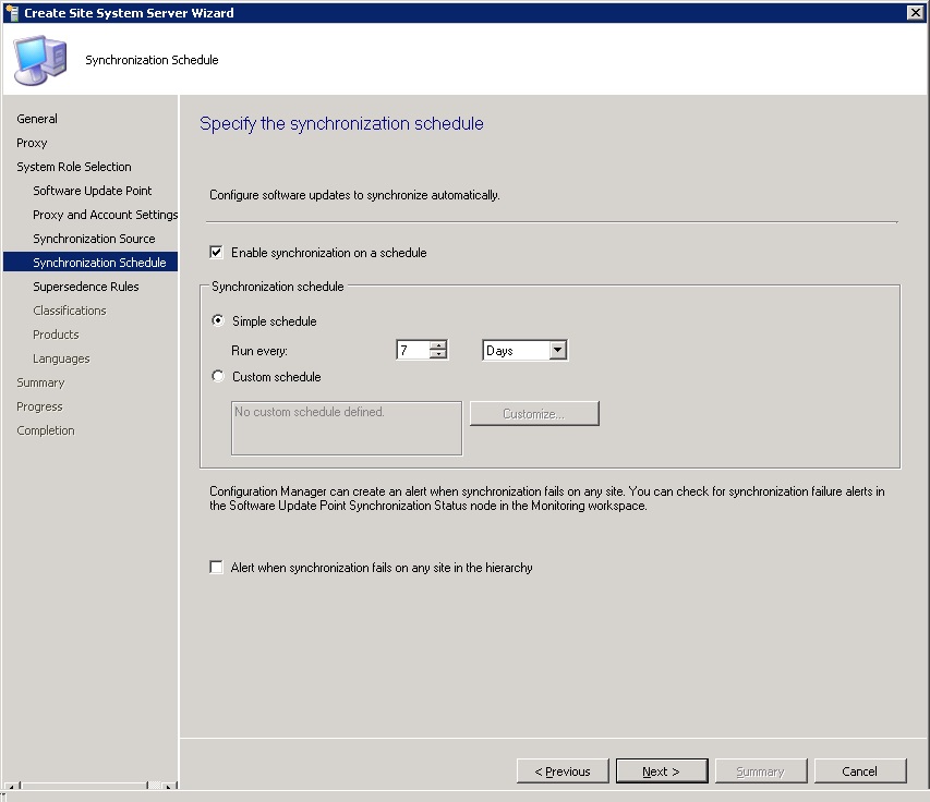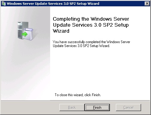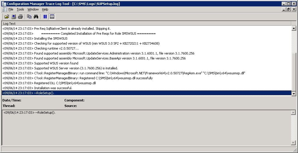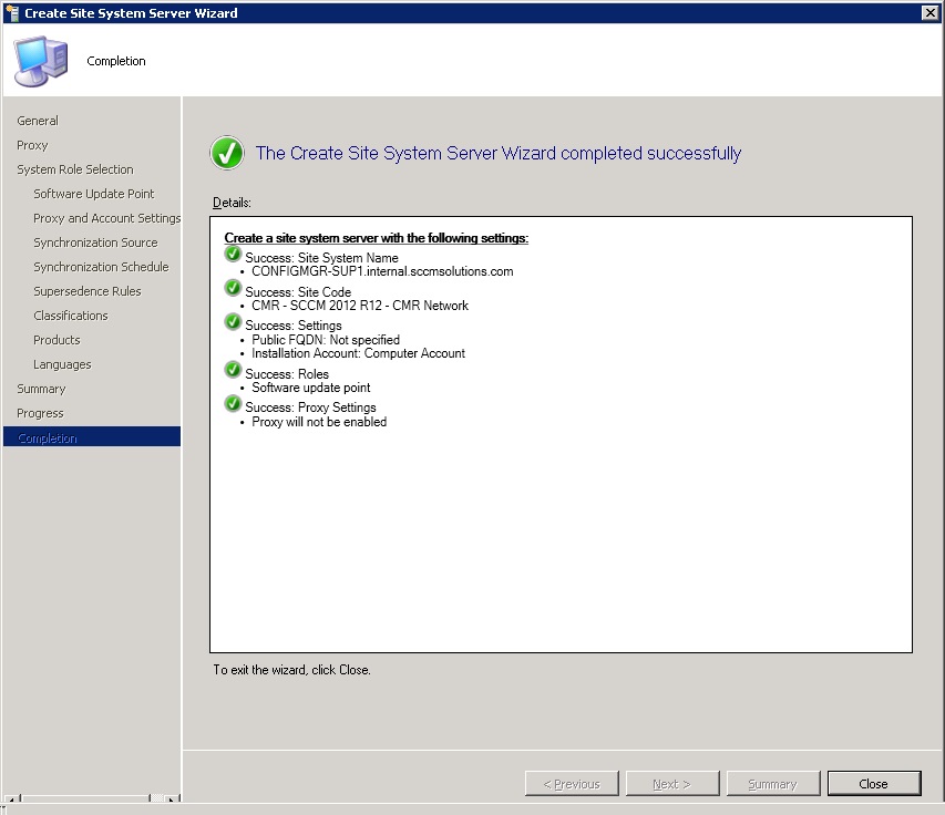 Continue the wizard through as per the previous WSUS install until complete. Then patch the SUP server with MS KB’s 2720211 and 2734608.