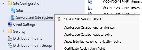 Before the SUP role can be added in, the remote server must be added into SCCM as a site system. In the SCCM console go to the Administration workspace and choose Site Configuration>Servers and Site System Roles. Select ‘Create Site System Server’