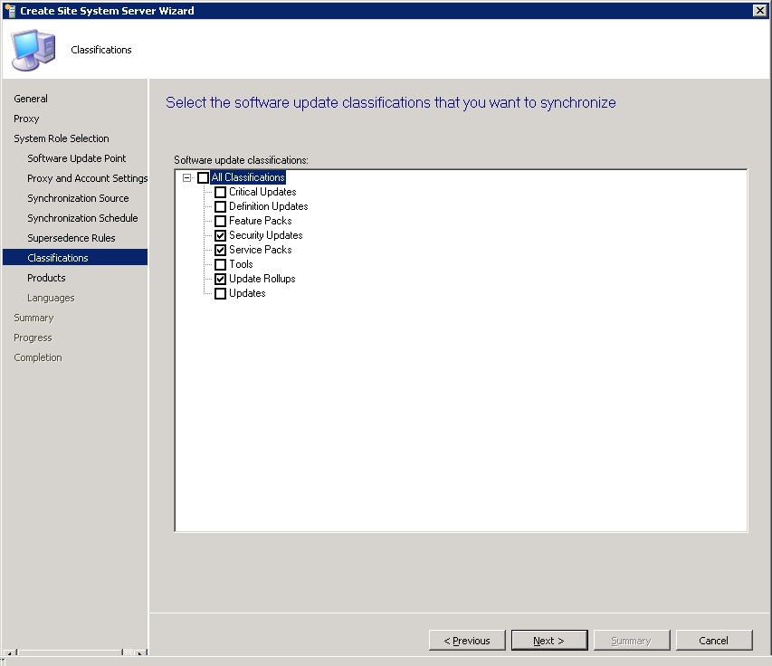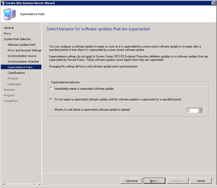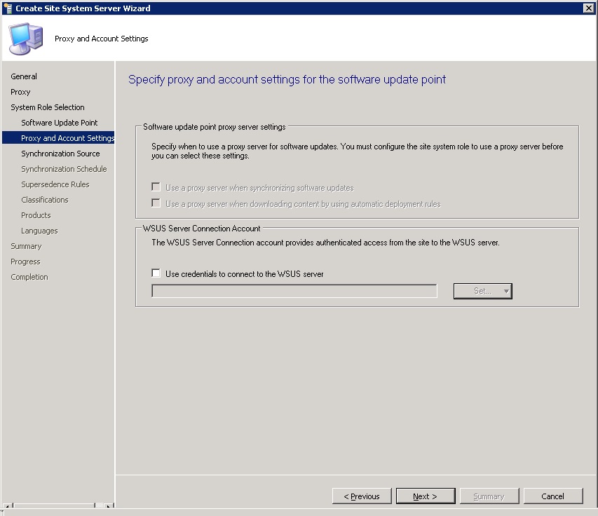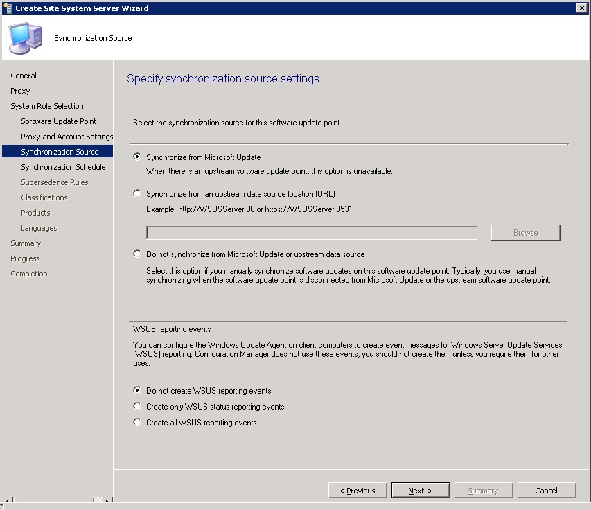 Note that the installation has taken place on a Windows 2008 R2 server and that the site server is not going to be used as a SUP. For remote WSUS configuration on Server 2012 see here.