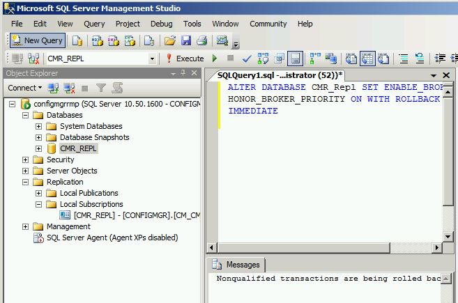 ALTER DATABASE <sitecode>_Repl SET ENABLE_BROKER,