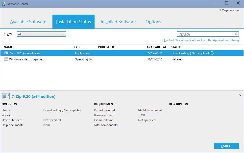 I created another installation, this time 7-Zip 9.20 x64 and pushed out the deployment. I again checked that policies have replicated between DB & replica DB, to ensure that the number of items in dbo.Policy match. This means I should be have the application available to me if the site database is offline. To replicate this I have stopped the SQL services for my site database.
