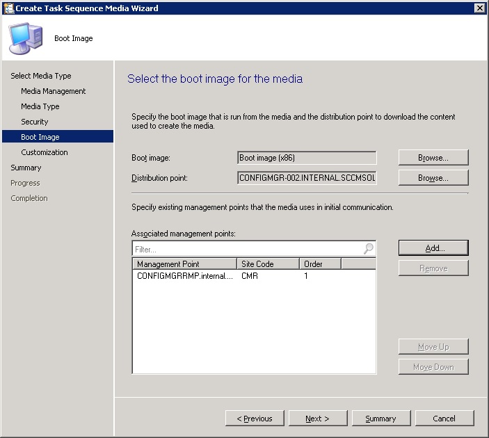 With the site server online I have created boot media for my Task Sequence that will use the site systems with the roles offloaded from the site server – namely the DP and replica MP.