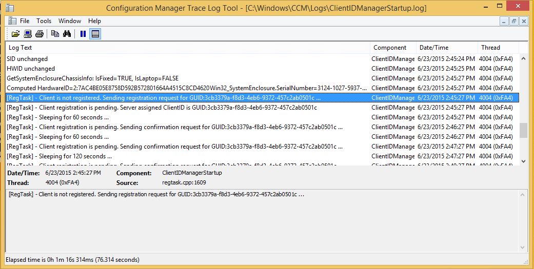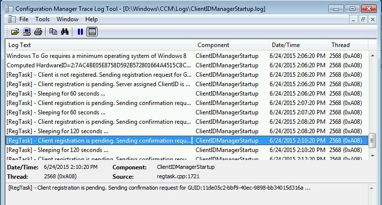 ‘[RegTask] – Client is not registered. Sending registration request for GUID:3cb3379a-f8d3-4eb6-9372-457c2ab0501c …’ and ‘[RegTask] – Client registration is pending. Server assigned ClientID is GUID:3cb3379a-f8d3-4eb6-9372-457c2ab0501c’.