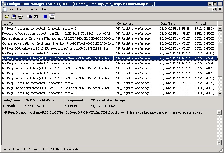 ‘MP Reg: Did not find client(GUID:3cb3379a-f8d3-4eb6-9372-457c2ab0501c) public key. This may be because the client has not registered yet.’