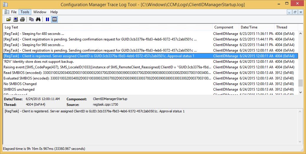 ‘[RegTask] – Client is registered. Server assigned ClientID is GUID:144349f0-c520-4810-9c7c-366c0fc1d6f8. Approval status 0’