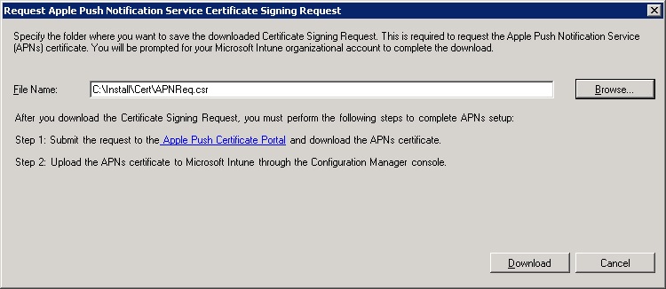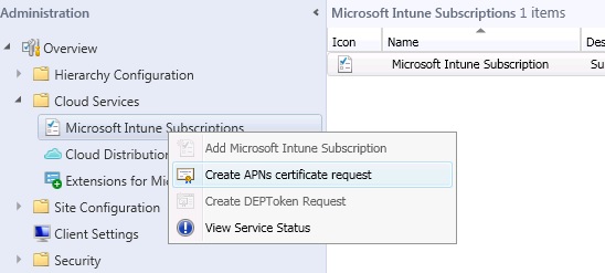 To manage Apple iOS devices an APN (Apple Push Notification) certificate is required. To make a request for the certificate you need to open up the ConfigMgr console and navigate to the Administration workspace and select Cloud Services>Microsoft Intune Subscriptions. Right click and choose ‘Create APN certificate request’.