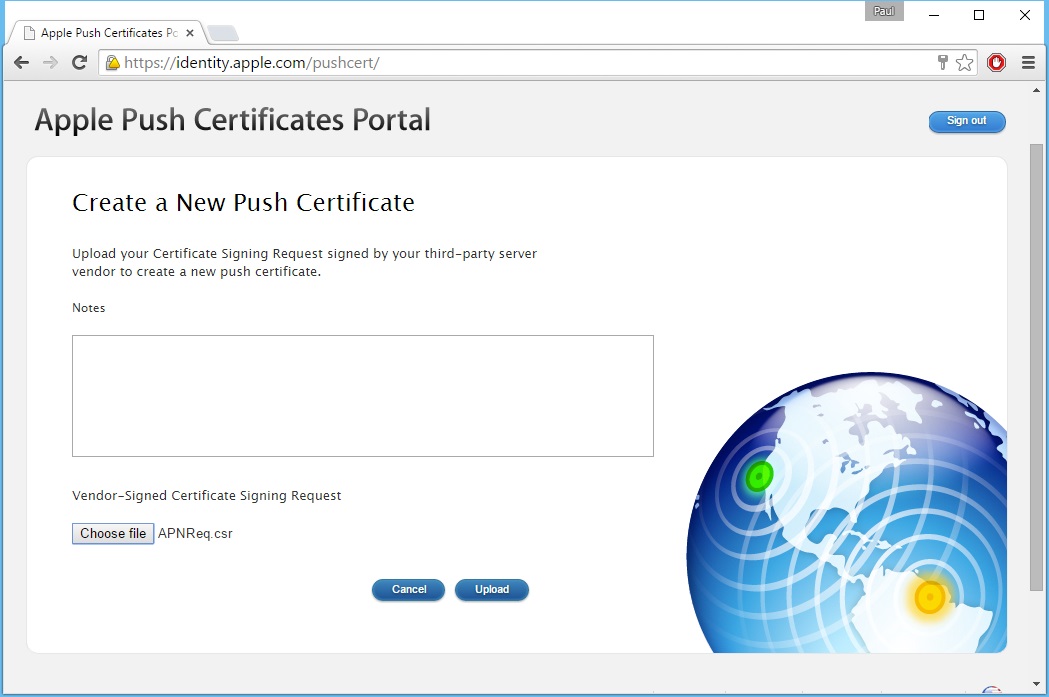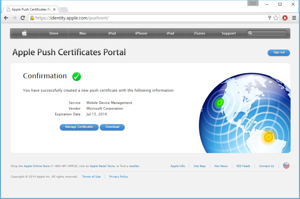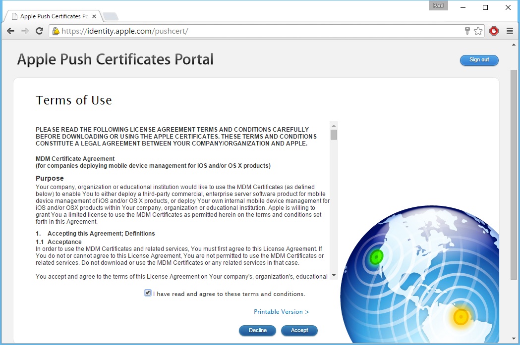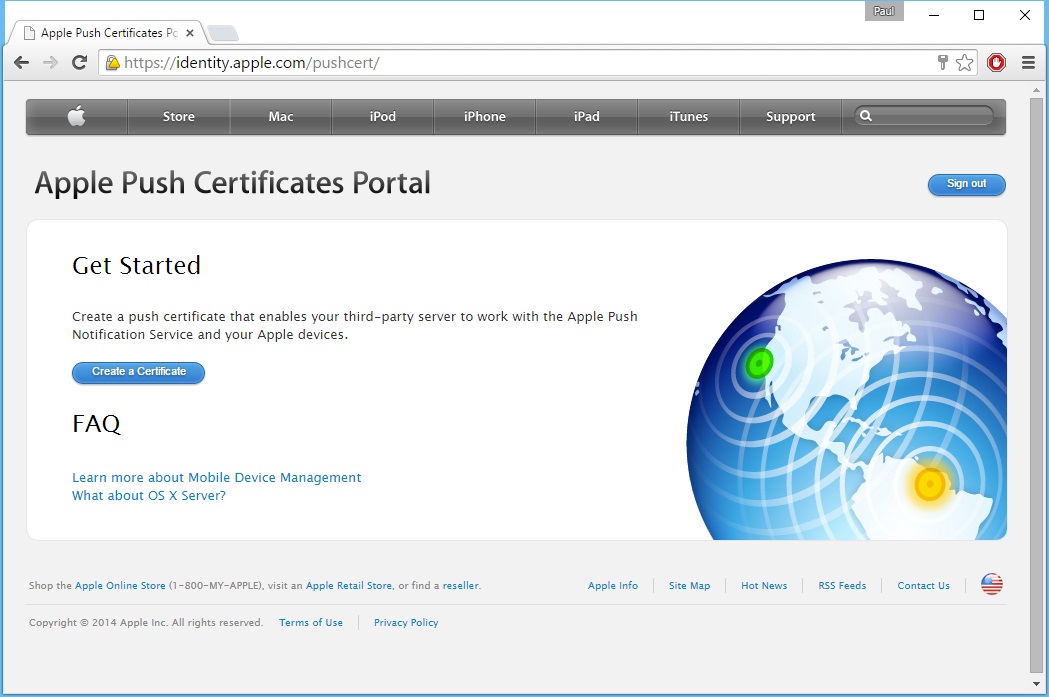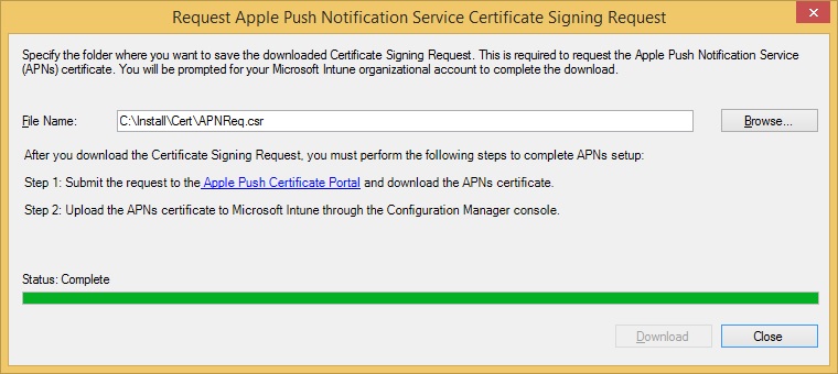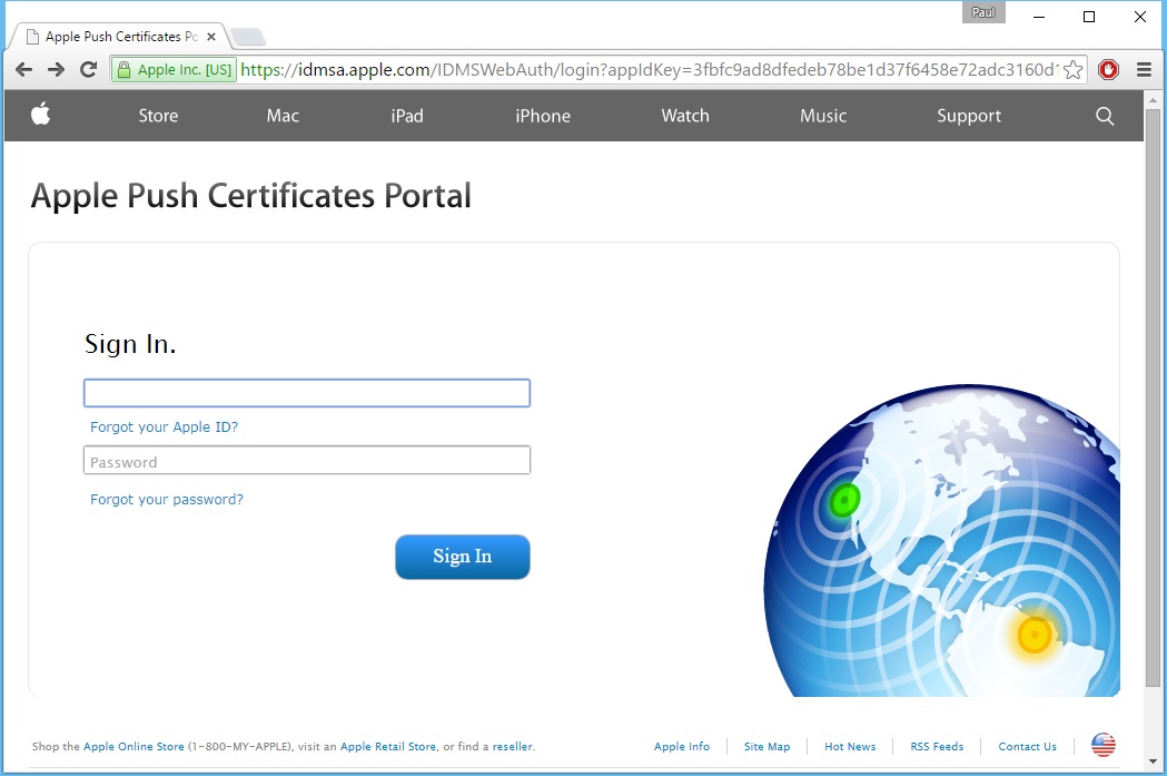 Connect to the Apple Push Notification Portal at https://idmsa.apple.com/IDMSWebAuth/login?appIdKey=3fbfc9ad8dfedeb78be1d37f6458e72adc3160d1ad5b323a9e5c5eb2f8e7e3e2&rv=2. Note that it is recommend that you do not use Internet Explorer to do this as there are issues downloading the .pem file. I have tested this on Microsoft Edge and the site does not load properly once logged in. Therefore I am using Google Chrome.