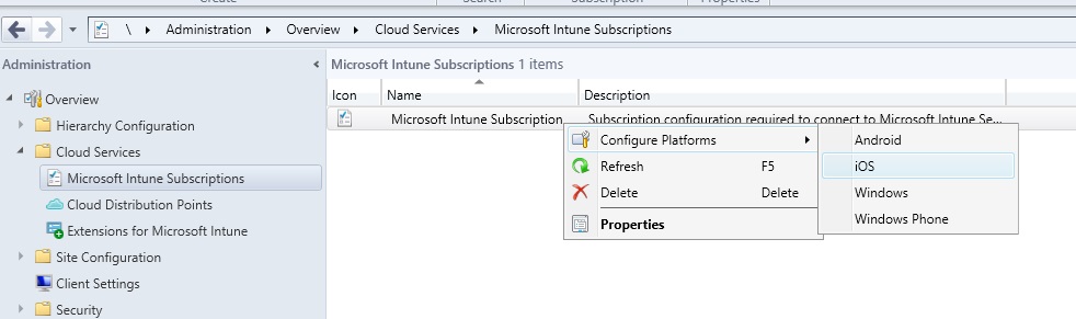 In the ConfigMgr console return to the Administration workspace. Go to Cloud Services>Microsoft Intune Subscriptions. Right click Microsoft Intune Subscription and select Configure Platforms>iOS