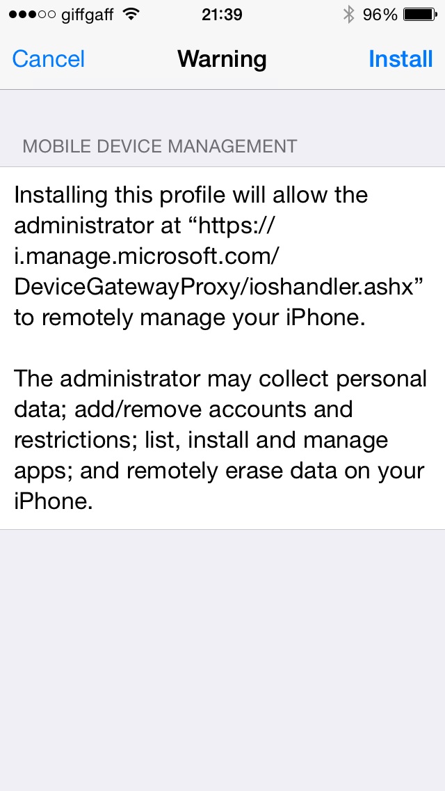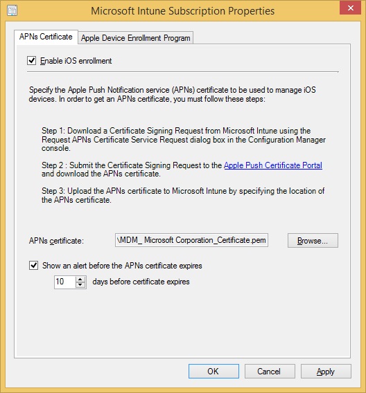 Enable iOS enrollment and browse to select the .pem file. I’ve also ticked to be alerted 10 days before the expiration of the certificate. Click Ok. (Note there is a bug with ConfigMgr 2012 R2 SP1 and the alert check box – if using this version do not tick the box)
