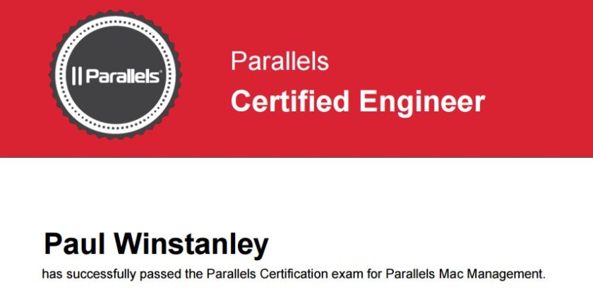 Today I have undertaken the Parallels Mac Management exam and have passed this with flying colours – 100% pass mark! Which means I am now a certified Parallels Mac Management engineer for the next 12 months. I’m pretty chuffed by this.