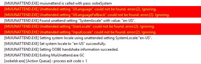 but things aren’t looking so sweet in the OOBE phase with the errors ‘Unattended setting could not be found. error:(2). Ignoring’ being generated for UILanguage, UILanguageFallback, UserLocale and InputLocale. In fact, only the SystemLocale was being successfully applied on this pass.