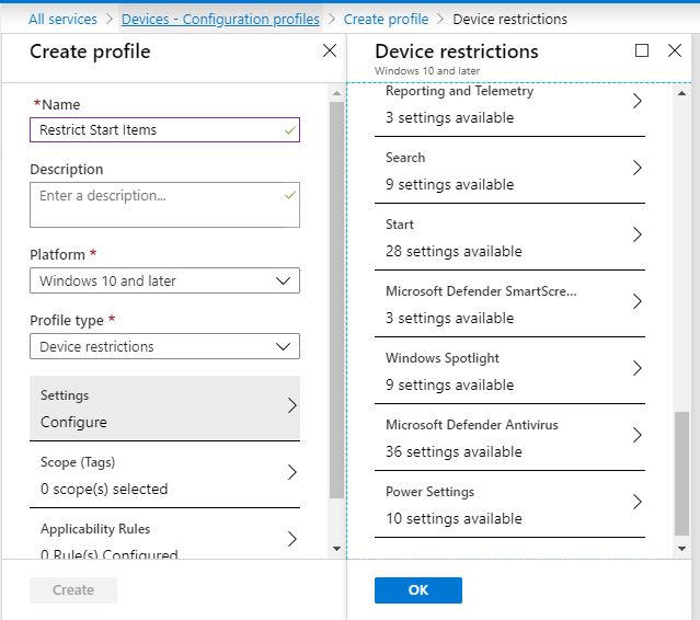 We are now presented with the Device restriction categories available to us. We are going to select the Start settings and you’ll note we have 28 settings available to us to choose from.