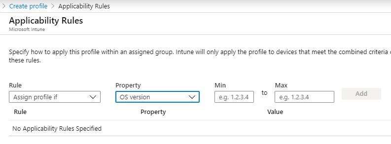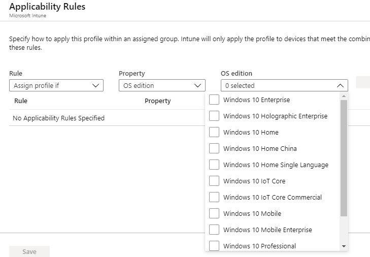 After clicking OK a couple of times, we can then set any Scope Tags or Applicability Rules. Applicability Rules allow you apply (or not assign) the settings to specific OS editions.