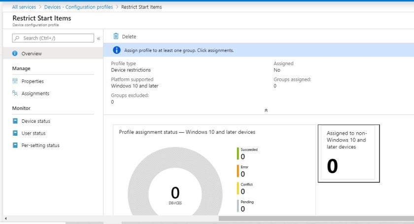 A quick refresh of my configured profiles shows my Restrict Start Items profile as Assigned.