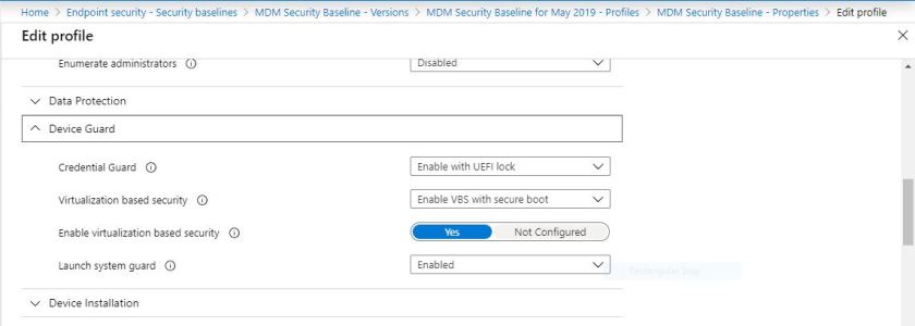 There are two ways to implement Credential Guard from within Intune. One way is by implementing the Windows Security Baselines. Under the Device Guard section you’ll see the following.