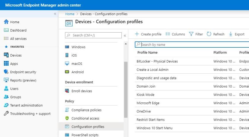In the MEM admin center, select Devices\Configuration profiles. Click the Create Profile link.