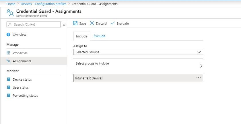 Next up, we need to assign out the profile. You should hopefully becoming familiar with this process. Look at older posts in the series if you need to refresh your memory. I’ve clicked the Assignments link and pushed out to some test devices. A wise choice when enabling Credential Guard.