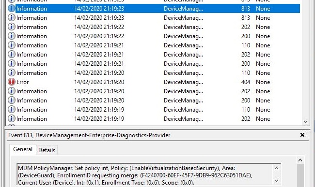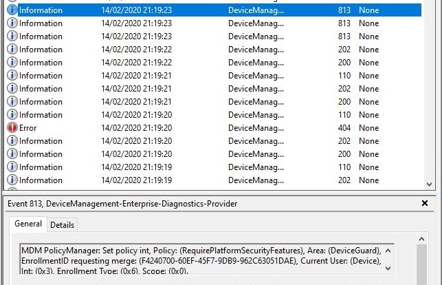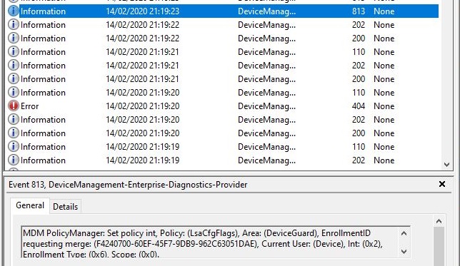 In the DeviceManagement-Enterprise-Diagnostics-Provider\Admin log I can see each of the registry keys being enabled.