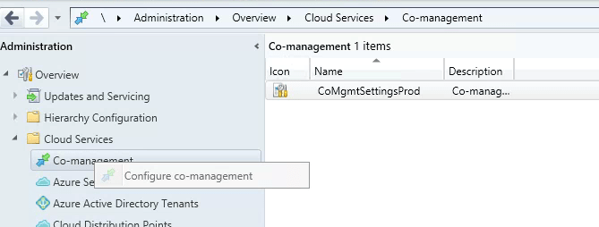 In the ConfigMgr console, navigate to Administration\Overview\Cloud Services\Co-management. Right click and choose Configure co-management. As you can from my screenshot, this is grayed out as I have already enabled co-man in my environment.