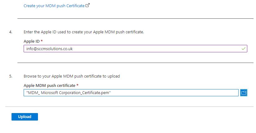 Back in the MEM admin center, enter the Apple ID details of the accoutn used to create the push certificate and then click the folder icon in step 5 and point ito the push cert.