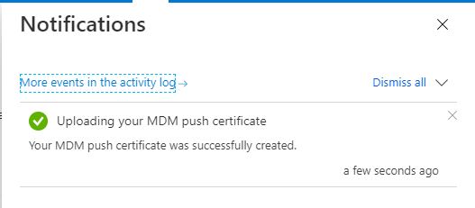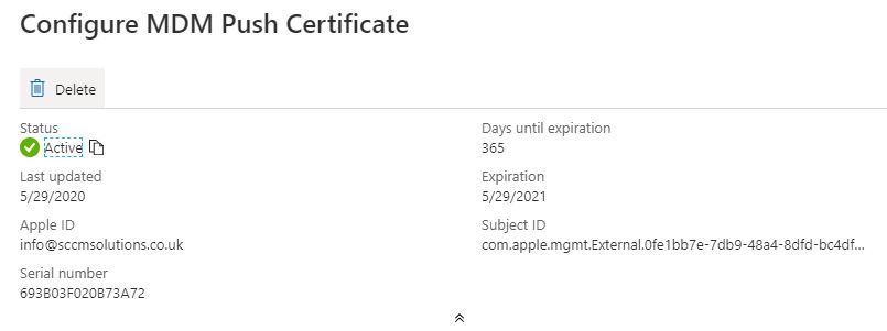 The admin center will show an Active certificate. Make a note of the Expiration date. You will need to renew the certificate before it expires, otherwise all enrolled devices will need to be re-enrolled.