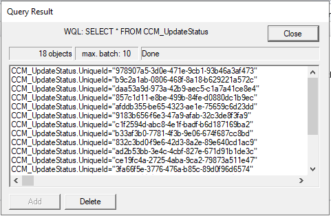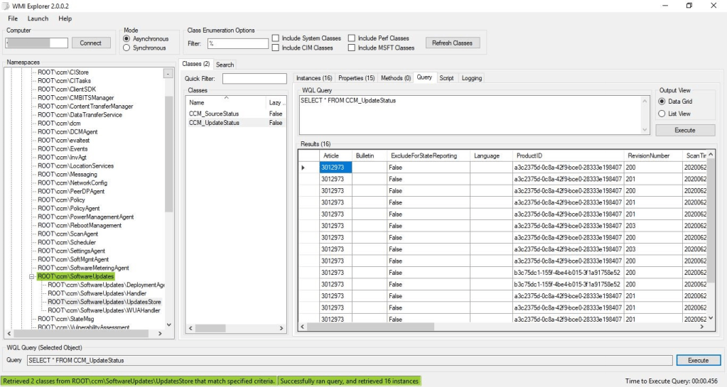 If you look at the Query field at the bottom, this has already populated a WQL query for us. SELECT * FROM CCM_UpdateStatus and by clicking the Execute button we can return the details we need.