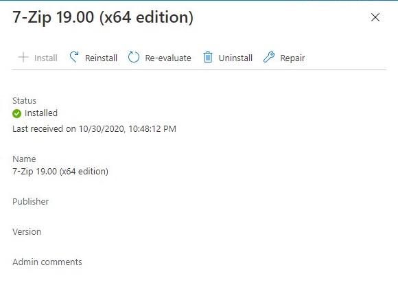 When the Admin Center loads up highlighting the particular device you selected in the ConfigMgr console, click Applications. Select an application which is currently installed. You’ll see the new actions listed against the app.