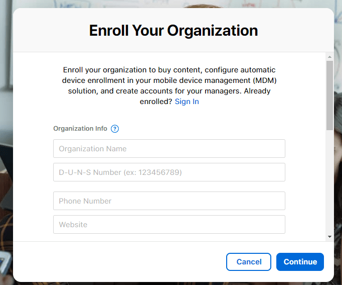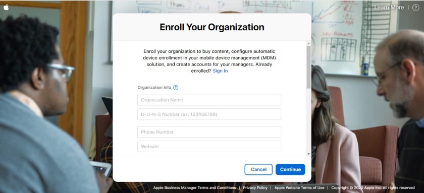 When it comes to enrollment for Apple Business Manager, you must follow their guidelines on the programme requirements. You must provide details of someone within the business who has the legal authority to sign and bind your organisation to the terms and conditions of Apple Business Manager. They will be contacted by Apple during the verification process.