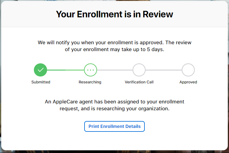 You’ll be informed that Your Enrollment is in Review. This can take up to 5 days to occur. The verification contact will receive a phone call from Apple to verify the business details and confirm that they have legal right to accept the Terms and Conditions for the company.