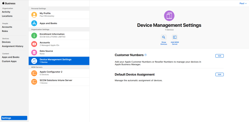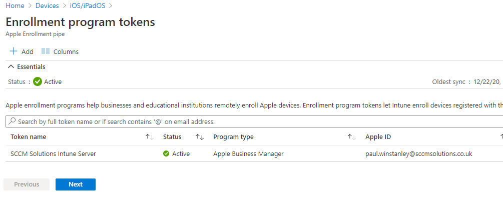 Now click on the token itself – so I click on the SCCM Solutions Intune Server token. We need to create an enrolment profile which will be pushed to the device when it automatically enrols. We are going to come back to this in the next blog post as we are going to create a Volume Purchase Programme token, which we will use in this profile.