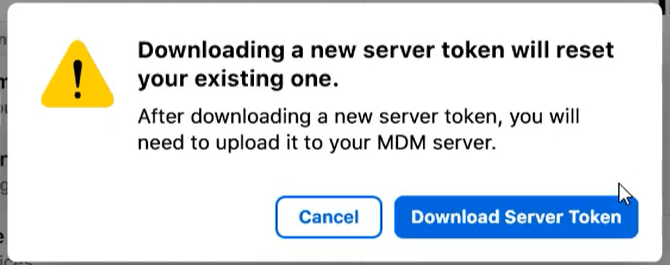 You’ll be informed that download a new server token will reset any existing tokens. This is OK since we are creating a new token so click the Download Server Token button. The token will be in .p7m format.