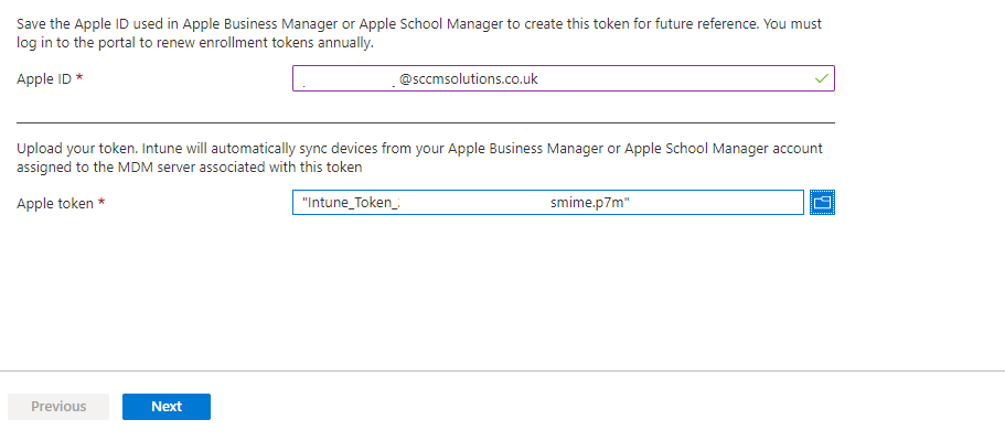 Go back to the Add enrollment program token blade in Intune and enter the Apple ID used to create the token and upload the Apple token. Click the Next button.
