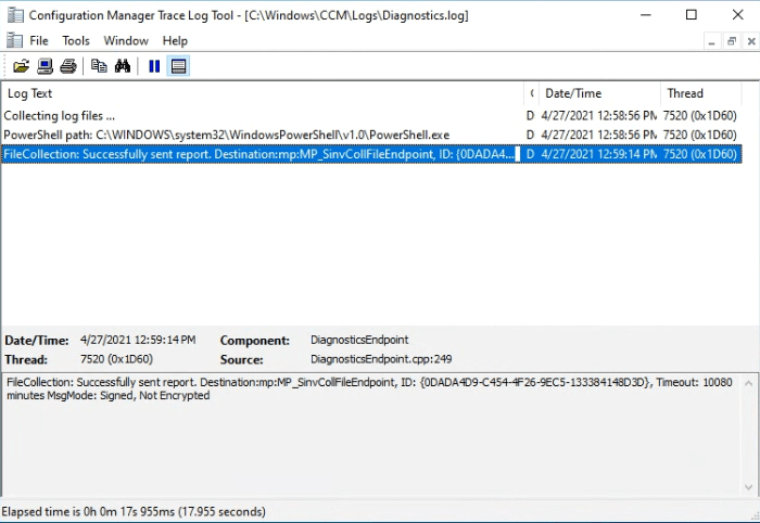 On the client device, you’ll find a log file in the windows\CCM\logs folder, diagnostics.log, which records the log collection attempt.