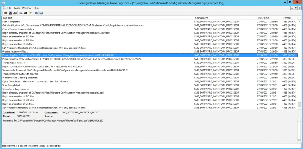 On the site server, you will see an entry in the Sinvproc.log for the SIC being process. Note the location, C:\Program Files\Microsoft Configuration Manager\inboxes\auth\sinv.box. Sinv.box is the inbox location where the logs will be copied to.