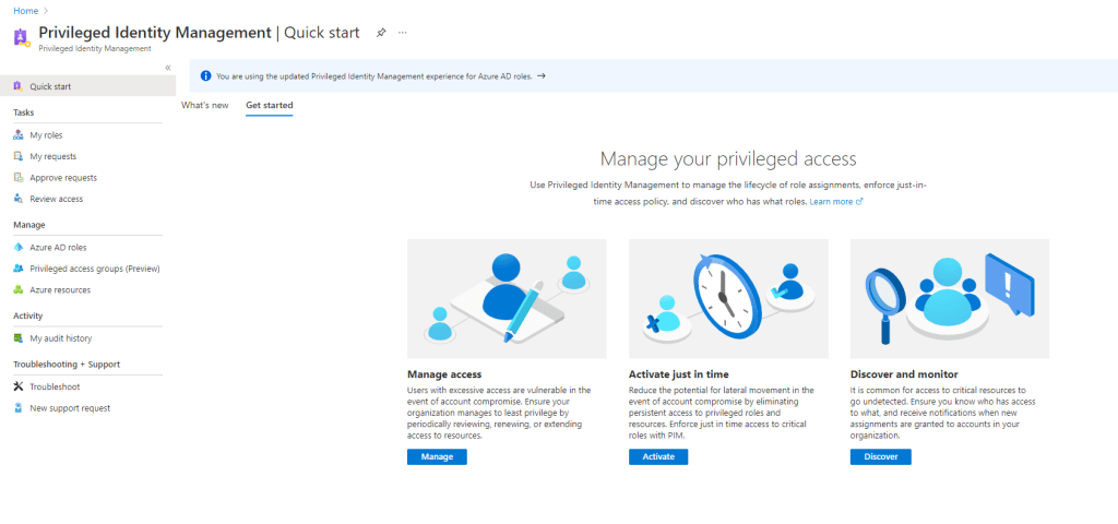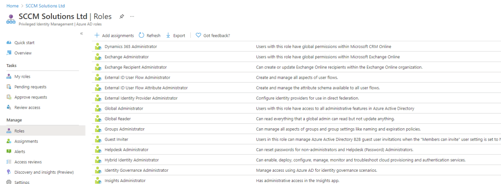 For configuring the solution, we use the Manage section of the menu. Click Azure AD roles.