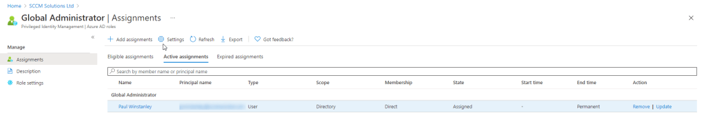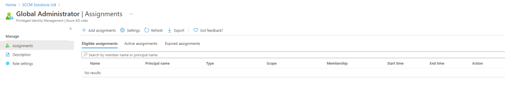 In the Assignments view, you’ll notice that Eligible assignments is blank, this is expected as we haven’t assigned anyone for PIM yet. Click Active assignments.