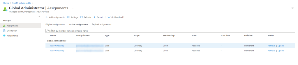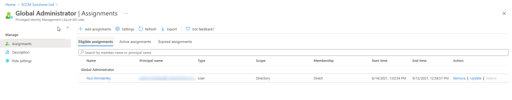 Here, you can see the current GA’s. They have an End time of permanent, effectively making them Permanent Access type accounts. I want to change one of the GA’s to use Just in Time, but keep one as permanent – for break glass reasons. To do this, I’ll click the Update action on the account I want to change.