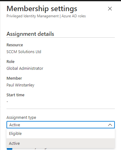 I have the choice of Active or Eligible in the Assignment type drop down, I’ll chose Eligible for Just in Time access.