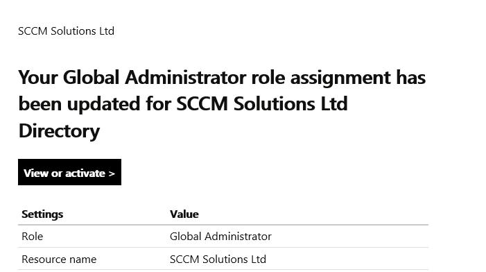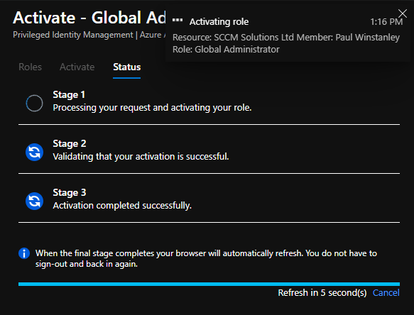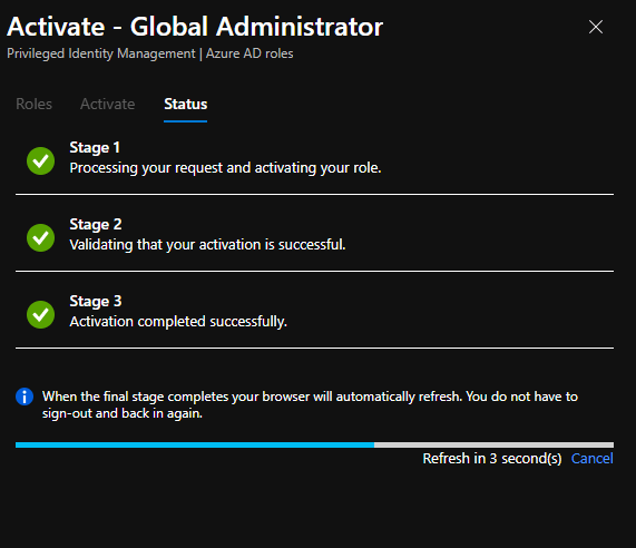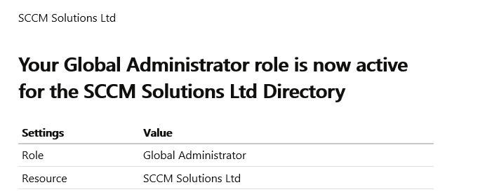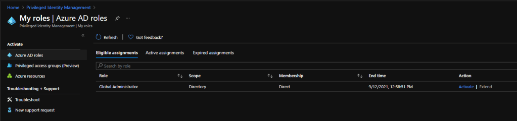 This will list the Eligible assignments for the account. In my case, the GA role assigned to my account earlier. Click the Activate link.