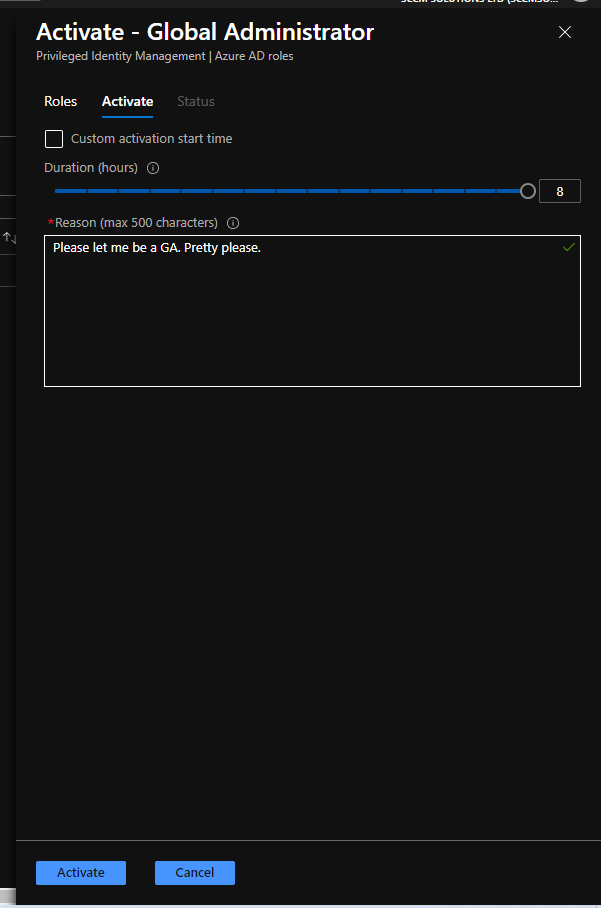 I can change the duration, with a maximum of those 8 hours as per the setting. I am required to enter a justification for access (as per the setting). If this needed approval, the approver would get the text in the Reason field. Start time, for access, can be customised with a start time and date. Click Activate.