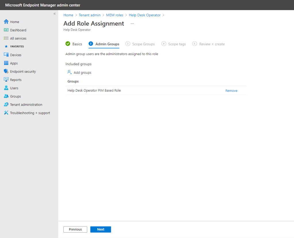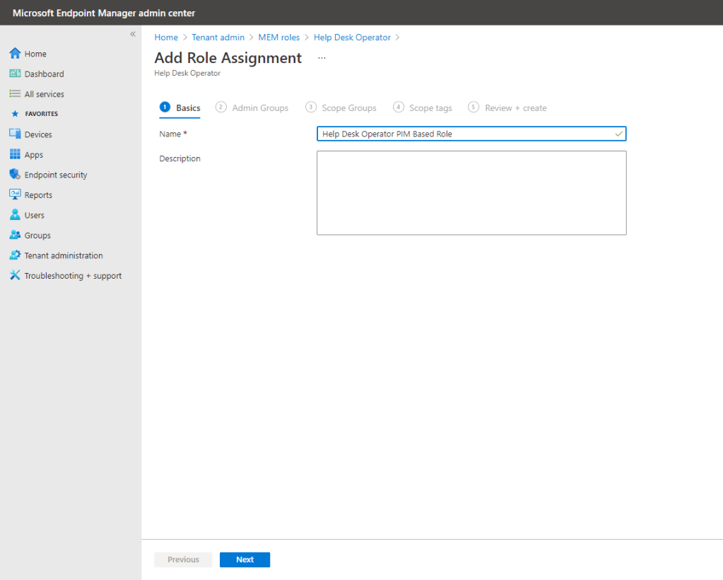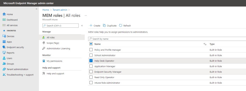 Back in the Endpoint Manager console, go to Tenant Administration and Roles. Click on the role you want to add the PIM assignment to, in my case the Help Desk Operator.